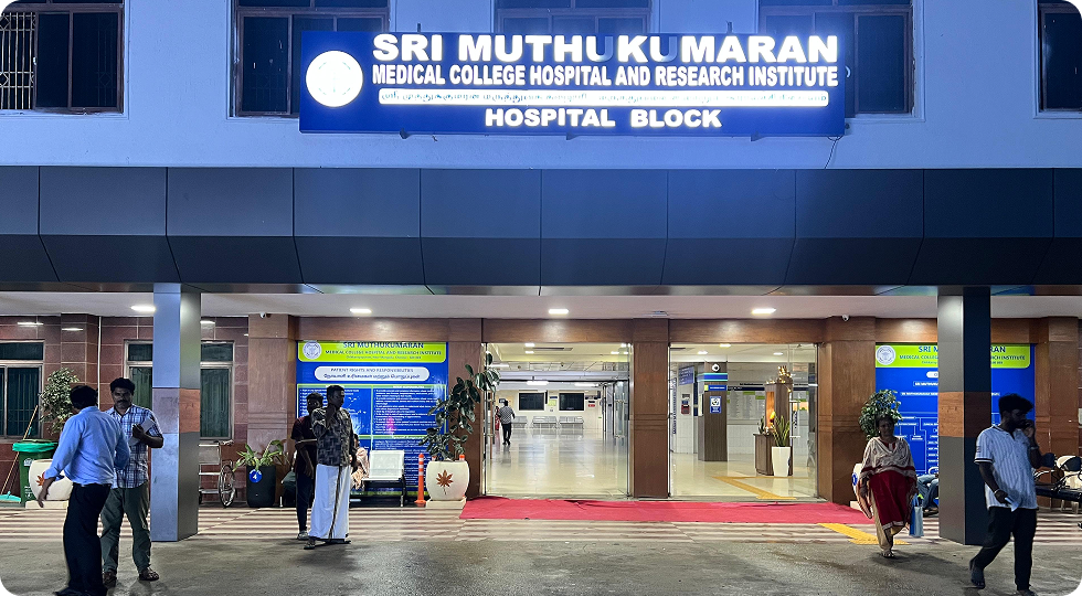Our Hospital was established in the year 2008 as a prerequisite to starting Sri Muthukumaran Medical College. Today, it stands tall as a six storied Multispeciality tertiary care hospital, serving to the medical needs of not only the people of the surrounding areas but also to people from various parts of the district. All medical and surgical specialities with duly qualified doctors function efficiently under one roof providing the best medical care to the poor and the needy. Sri Muthukumaran Medical College Hospital is now a NABH accredited and KAYAKALP certified hospital.